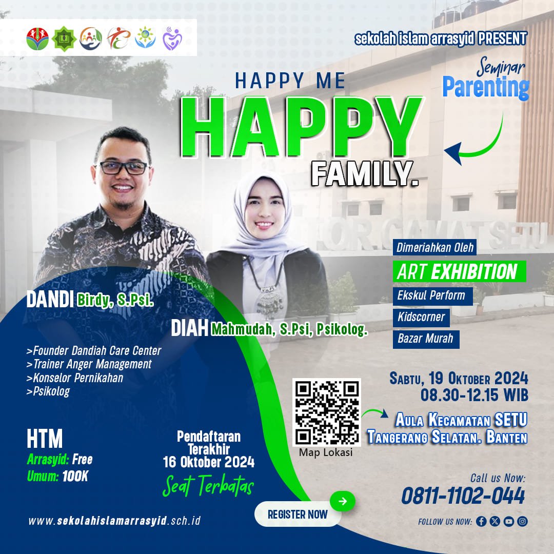Keluarga yang bahagia dimulai dari diri yang bahagia. Untuk itulah, Sekolah Islam Arrasyid dengan bangga mempersembahkan Seminar Parenting: "Happy Me, Happy Family", sebuah acara inspiratif yang dirancang khusus untuk para orang tua yang ingin menciptakan harmoni dan kebahagiaan dalam keluarga.