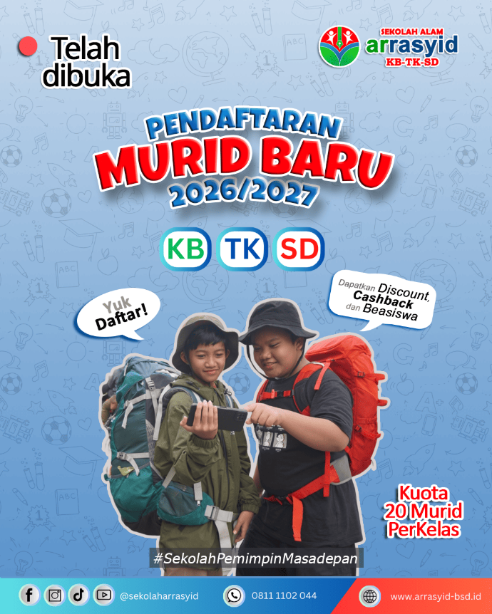 Penerimaan Murid Baru Sekolah Alam Arrasyid Tahun Ajaran 2026/2027 masih berlangsung . Simak timeline lengkapnya dan pastikan tidak melewatkan setiap tahapannya. Mari bergabung bersama kami, tumbuh dan belajar dalam pendidikan yang bermakna!